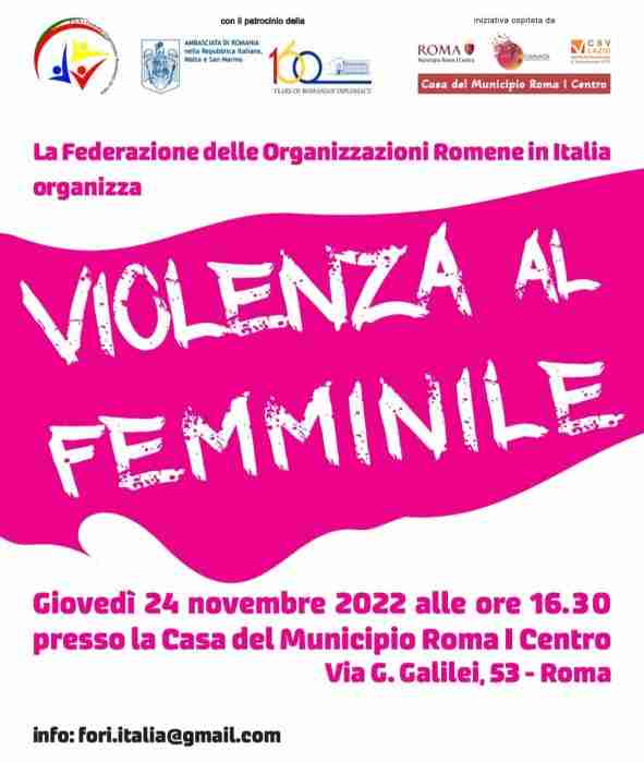 Federația Organizațiilor Românești din Italia F.O.R.I. organizează evenimentul „Violența feminină” care se va desfășura în sala Municipiului Roma I Centru,